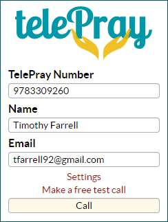 Go to webcall.telepray.com to access the login page. You may enter dashes in the TelePray number (978-330-9260), which are ignored. The Name and Email inputs are optional. The first time you connect to WebCall, you will be prompted for permission to access the microphone, which you must allow in order to transmit your voice into the conference.